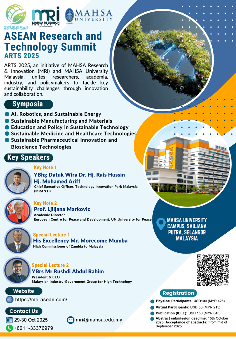 Acting as a catalyst for progress, the summit will emphasize actionable outcomes and foster practical collaborations among participants, ensuring that discussions move beyond the theoretical and toward tangible advancements in science and technology throughout the region. Scheduled for 29th – 30th October 2025 at MAHSA University’s Saujana Putra campus in Selangor, Malaysia, ARTS 2025 will serve as a vital platform for knowledge exchange, strategic partnerships, and meaningful dialogue across disciplines and sectors. The summit will feature high-level discussions, research presentations, and networking opportunities focused on sustainable technology and innovation.